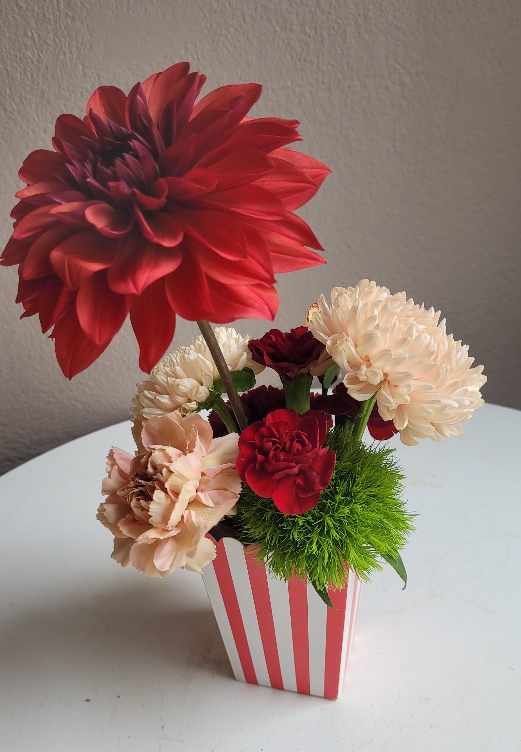 Työviikon päätteeksi on kiva rentoutua kukkien parissa. Työpajassa rakennetaan moderni ja leikkisä asetelma rasiaan
